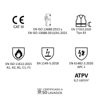 EPI de visibilidad realzada para situaciones de riesgo medio y destinado a la protección del torso y extremidades superiores del usuario, con excepción de cabeza y manos, contra riesgos térmicos de inflamabilidad, calor convectivo, calor radiante, calor por contacto, contra riesgo de acumulación de cargas electrostáticas y contra riesgos térmicos de un arco eléctrico de 4 kA (APC 1).