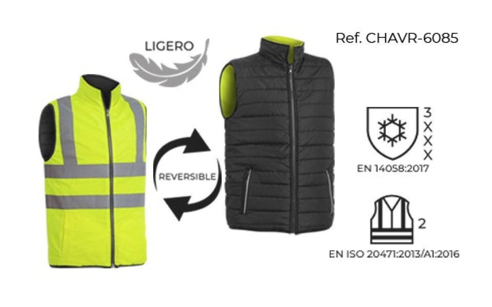 Chaleco acolchado ligero REVERSIBLE, que puede ser usado por un lado con ALTA VISIBILIDAD Clase 2 (EN20471), para señalizar visualmente la presencia del usuario en condiciones de riesgo, así como un chaleco elegante "casual" para otras actividades en el reverso.