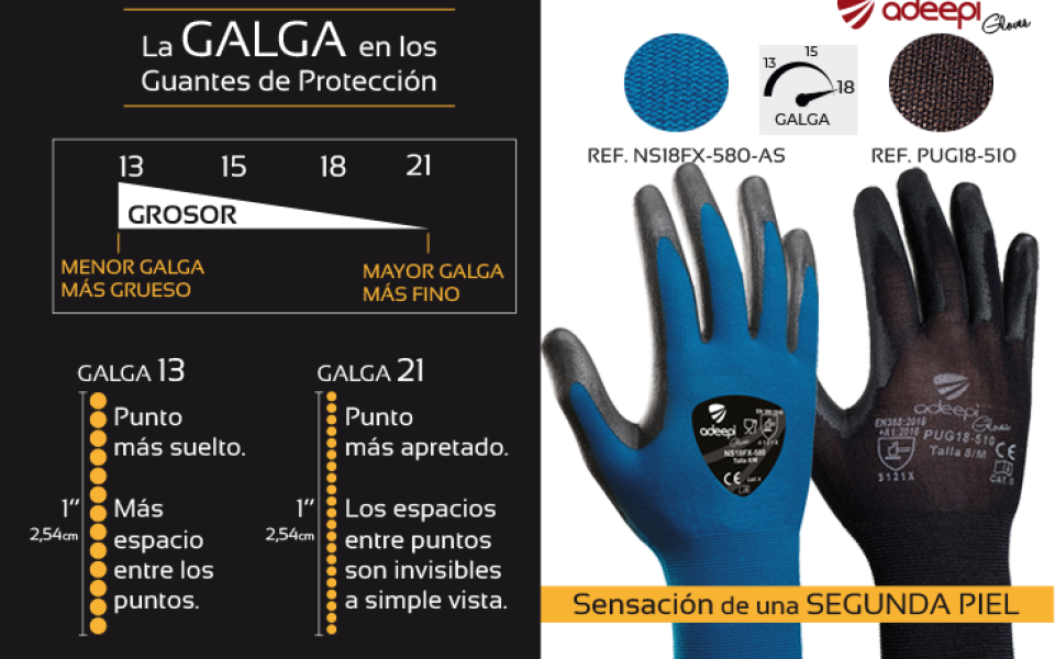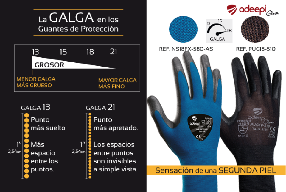 Los guantes de protección hoy en día suelen oscilar entre las galgas 13 y 21. Cuanto mayor sea la galga, más fino será el guante, y cuanto menor sea la galga, más grueso y menos desteridad tendrá el guante.